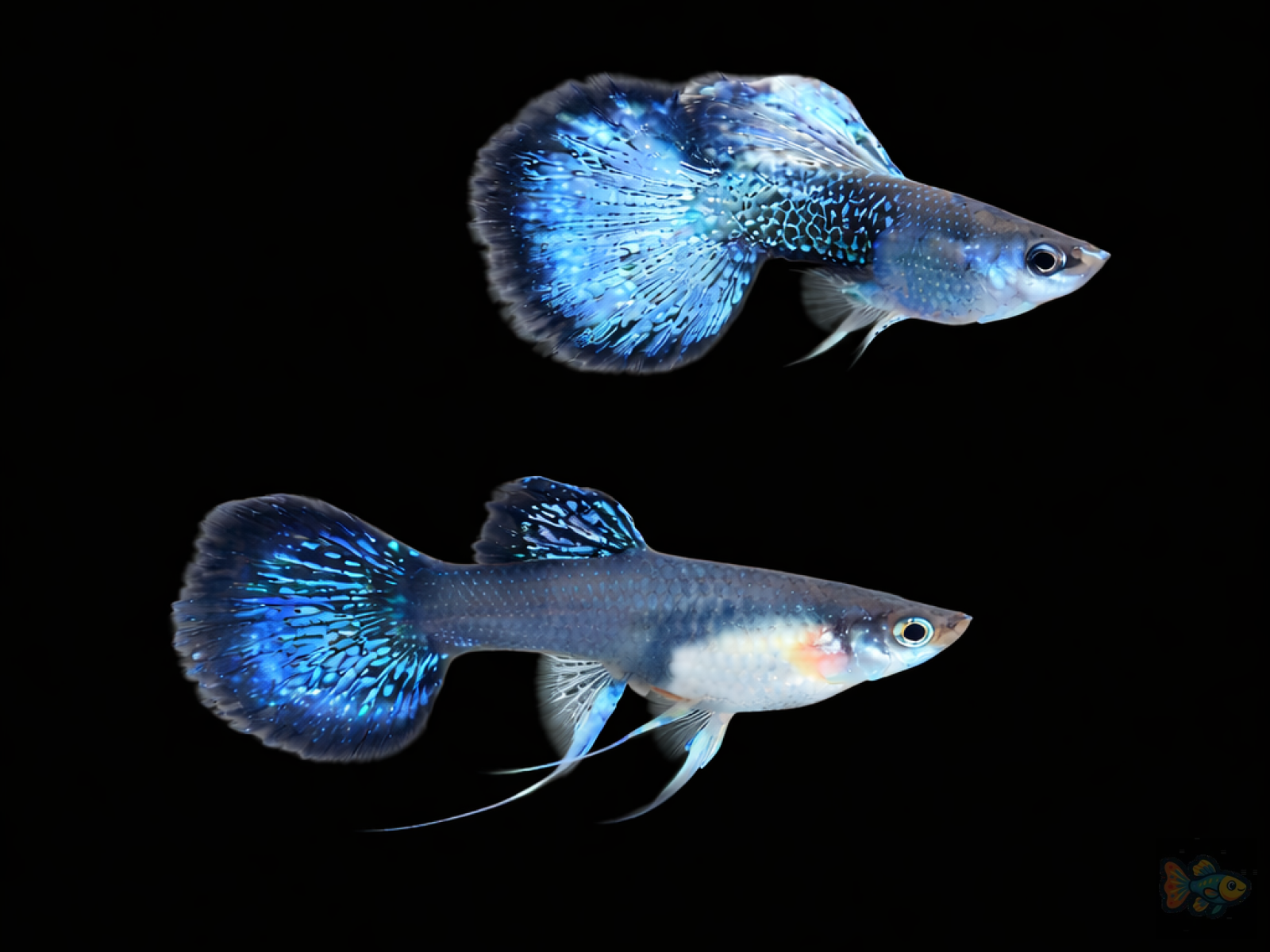 Our listings often show adult guppies on video so you can see the best colour and pattern reference. The fish shipped are usually younger and will colour up as they mature. We do not use filters or enhancements in our videos.